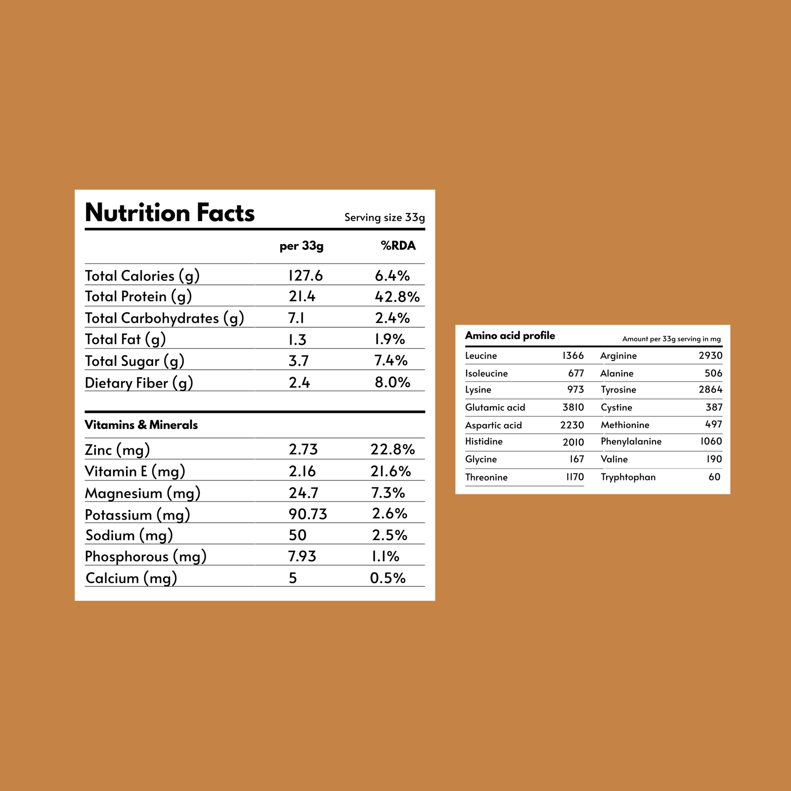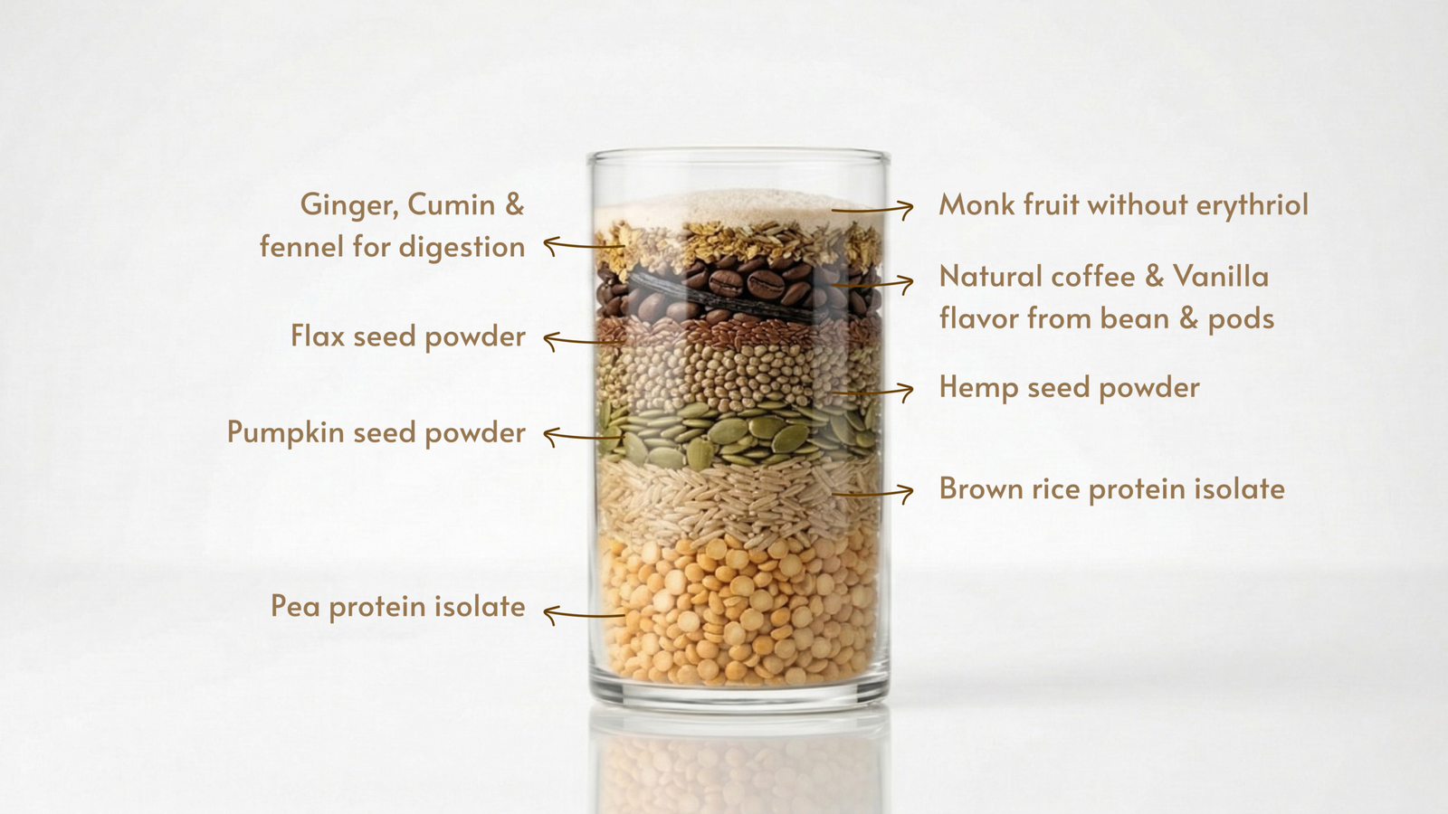 Pea & Brown rice protein isolates, Pumpkin seed powder, Hemp seed powder, flax seed powder, Digestive blend (Ginger, Cumin & fennel), Natural flavor extracted from real nuts & fruits and Monk fruit